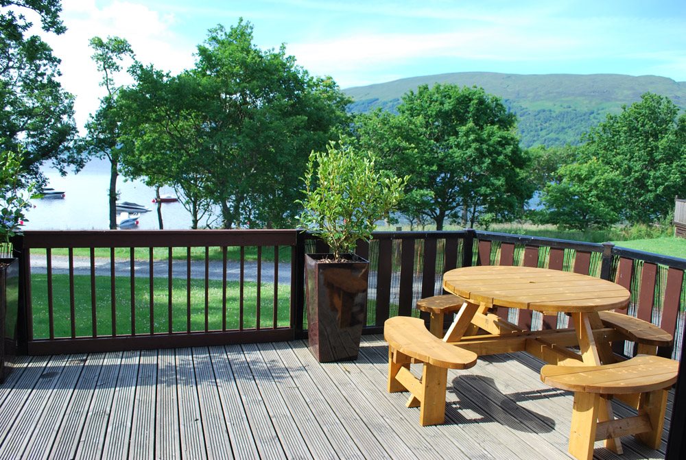 The lodge has four bedrooms: master en suite, double, twin and bunk room. There is a spacious open plan kitchen / dining / living room with patio doors that open to the large gated decking area with spectacular views looking out over Loch Lomond.